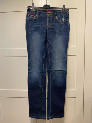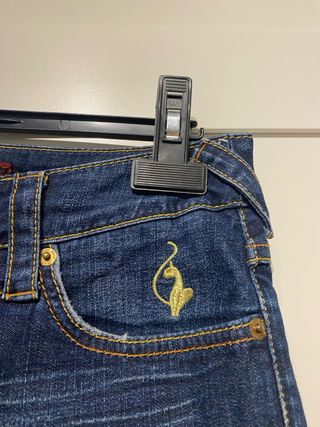 Pantalón vaquero de corte clásico usado 2 veces, tallaje pequeño. - Diseño de cinco bolsillos. - Costuras reforzadas.