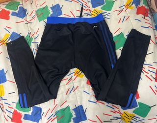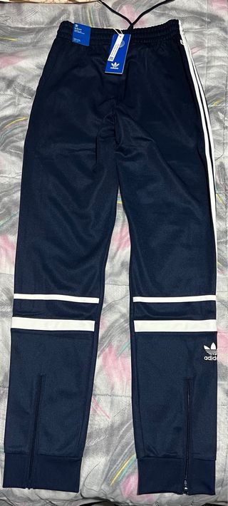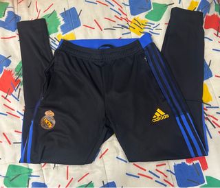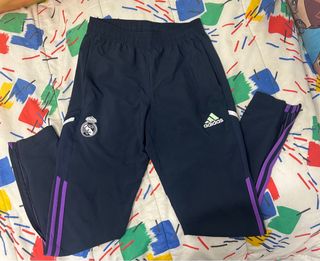 Pantalones deportivos del Real Madrid con el logo de Adidas. - Diseño con las icónicas tres rayas de Adidas en azul. - Escudo del Real Madrid bordado en la pierna. - Cintura elástica para un ajuste cómodo. - Talla XS.