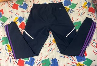 Pantalones deportivos del Real Madrid. - Diseño con el escudo del equipo. - Logo de Adidas en la pierna. - Detalles de rayas moradas en los laterales. - Cintura elástica. - Talla XS.