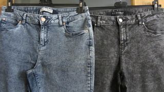 Pantalones vaqueros grises y azules, y jerseys