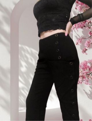 Pantalon El Caballo, color negro, pata recta, lleva botones forrado y dorados en los laterales, con bolsillos y cremallera lateral. Talla 40. Composicion 55% Viscosa 45% Lana. Perfecto estado. Medidas Cintura 40 cm Cadera 50 cm Ancho pata 22 cm Largo 109 cm