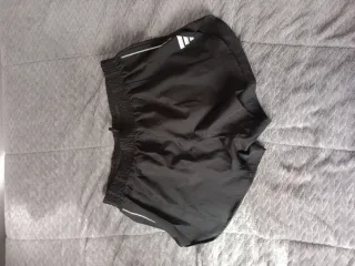 Pantalones cortos deportivos Adidas en color negro. Cuentan con cintura elástica y cordón ajustable. Talla L pero son mas pequeños, parece M/S. - Logo de Adidas en la parte inferior. - Tejido suave y cómodo.