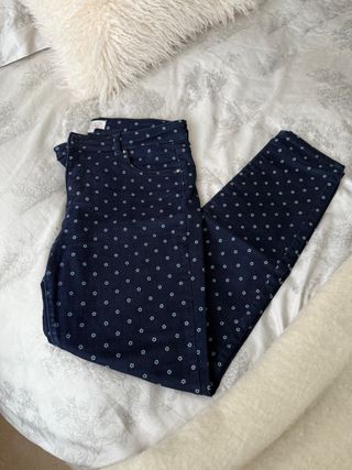 Pantalones vaqueros elásticos con un bonito estampado de flores blancas sobre fondo azul marino.