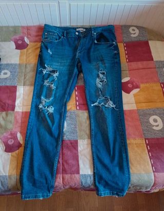 Pantalón vaquero estilo skinny. - Talla 27. - Destacar tiene unas manchas amarillas en la parte de alante y atrás ver últimas fotos. - Lavado desgastado. - Detalle de rotos en la pierna. - Parche en la parte trasera.