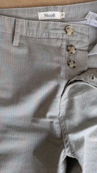 Pantalón de vestir con un diseño de rayas verticales en tonos beige y verde La talla es 36. Cierre con botónes. Tela muy cómoda. Queda ancho.