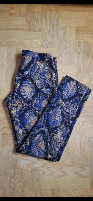 Pantalón de la marca New Saks con un diseño llamativo. - Estampado multicolor con detalles en azul y tonos tierra. - Diseño tipo barroco o damasco. - Corte ajustado.