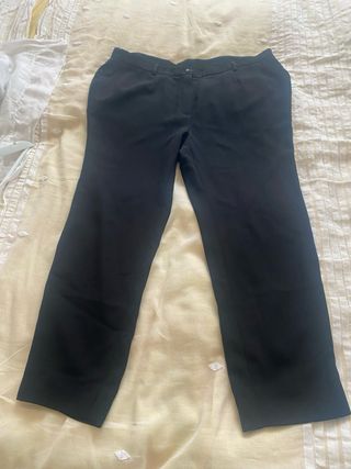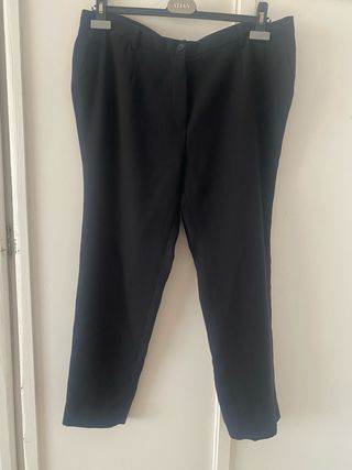 Pantalón de mujer. Color negro. Talla 36 más bien amplio, como una 38. Tiene cinturón que abrocha con dos argollas de tipo hueso, muy bonito. Tiene pespuntes en blanco de adorno. Tiene una pinza a cada lado y bolsillos laterales. Es de tela tipo crepé de poliéster. No arruga nada. Está completamente nuevo.