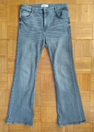 Pantalón vaquero en color gris tipo Flare de Pull and Bear. Cintura alta. Puesto pocas veces porque me queda excesivamente largo y tengo que subirlo muy arriba. Talla 44. Muy bien estado excepto por el sobado de los bajos, que al arrastrar lo pisaba (se puede ver en las fotos). Medidas en la segunda foto. Borde superior 43 cm Bolsillo a bolsillo 47 cm Ancho entrepierna 51 cm Largo 113 cm Ancho pata 25 cm