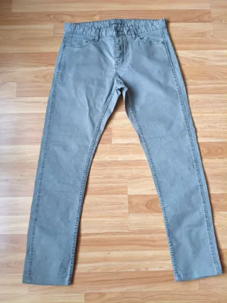 Pantalón de corte chino en color gris. - Diseño clásico. - Tejido resistente. - Interior algo amarilleado de estar guardado. - Le falta el botón del bolsillo trasero.
