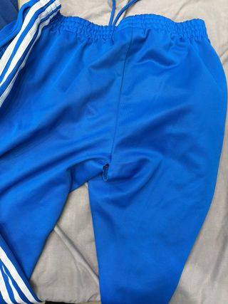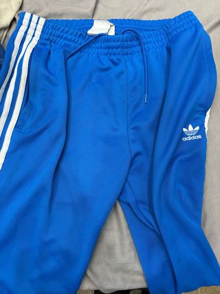 Pantalón deportivo Adidas de color azul. - Diseño con las tres rayas blancas. - Logo de Adidas en la pierna. - Cintura elástica con cordón. - Pequeño agujero en la entre pierna
