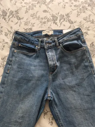 Pantalón vaquero claro de corte recto con final un poco acampanado . - Abertura en la rodilla. - Cierre de cremallera y botón. -Talla 34 -Usado, pero en buen estado