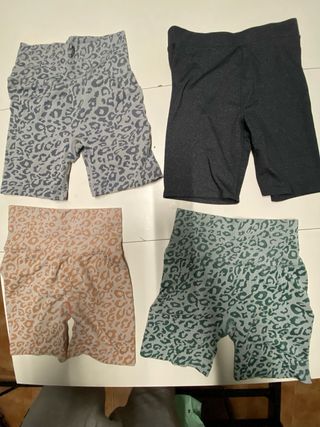 Conjunto de cuatro pantalones cortos deportivos con estampado. - Un pantalón negro liso. - Tres pantalones con estampado de leopardo en diferentes colores: verde, gris y beige.
