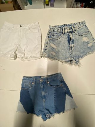 Conjunto de tres pantalones cortos vaqueros. - Pantalones vaqueros blancos. - Pantalones vaqueros con efecto desgastado. - Pantalones vaqueros con parches de diferentes tonos de azul.
