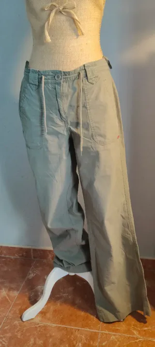 Pantalones cargo de color beige con cordón en la cintura. - Bolsillos laterales con botón. - Diseño moderno y funcional. tienen una pequeña mancha en un bolsillo, pero sin mas