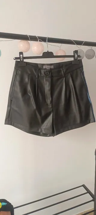Pantalones cortos de efecto piel, un básico versátil para cualquier armario. - Cintura alta. - Cierre de botón y cremallera. - Bolsillos laterales. Medidas: - Cintura: 35 cm. - Largo: 38 cm. - Caderas: 50 cm.