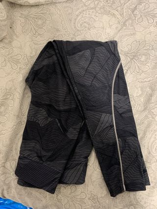 Pantalones deportivos con un diseño moderno y llamativo. - Estampado de líneas onduladas en tonos grises y negros. - Detalle de costura lateral en color claro. - Cintura elástica para mayor comodidad.