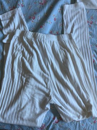 Conjunto de dos piezas en color blanco, ideal para un look cómodo y a la moda. - Top con tirantes y escote. - Pantalón largo con cintura elástica y cordón. - Tejido acanalado.