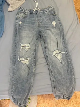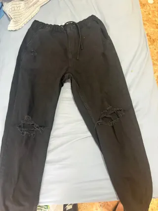 Pantalones vaqueros de corte moderno con un estilo desgastado y detalles rotos. - Cintura elástica con cordón. - Puños ajustados. - Bolsillos delanteros y traseros. Los vendo porque no son mi talla 1 pantalón 9 y los dos 20