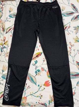 Pantalón técnico de chándal oficial de la línea World Padel Tour. Diseñado específicamente para ofrecer comodidad antes y después del partido, o para entrenamientos con temperaturas bajas. • Condición: Ha tenido algo de uso, pero se encuentra en muy buen estado. El tejido mantiene su elasticidad y no presenta enganchones graves. • Cintura: Elástica con cordón ajustable para mayor comodidad. • Bajos: Puños ligeramente ajustados para que no molesten con las zapatillas de pádel. • Diseño: Logos oficiales de WPT y Bullpadel visibles y bien conservados.