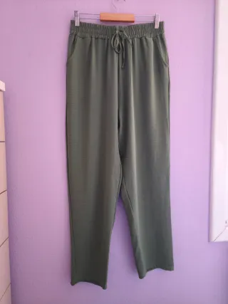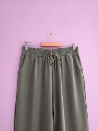 Pantalones de tela en color verde, con cintura elástica y cordón. Talla L aunque ponga otra talla - Cintura elástica con cordón. - Dos bolsillos laterales.