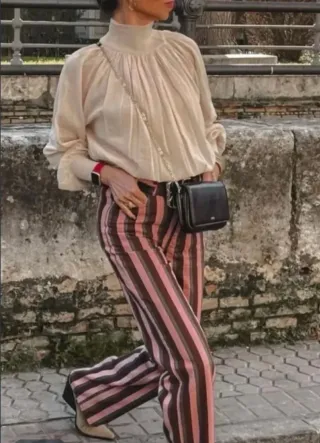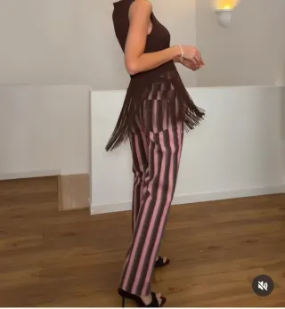 Pantalón de Zara con un diseño de rayas verticales en tonos marrones y rosas. - Diseño de rayas verticales.