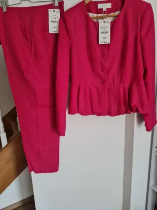 Conjunto de dos piezas de Zara en color rosa vibrante. El blazer talla M presenta un favorecedor corte peplum y el pantalón talla L, es de corte recto. - Blazer con cierre de botones. - Pantalón de talle alto. - Tejido de lino.