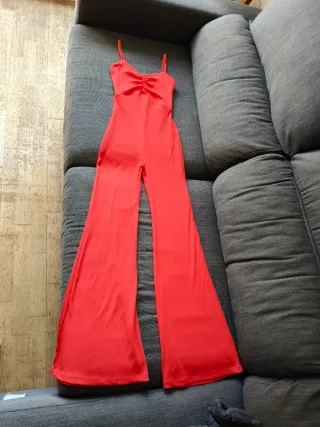 Mono largo de color rosa fuerte con pantalón de campana. - Tirantes finos. - Escote drapeado. - Tejido acanalado.