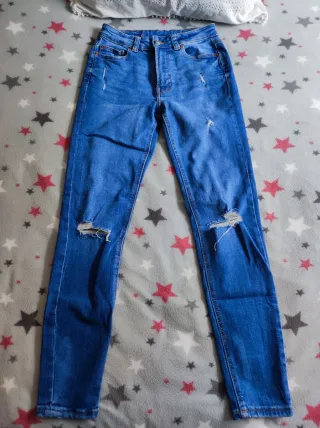 Pantalón vaquero pitillos chica, rotos (rodilla) chica, de cintura alta, color azul, talla 34 medida de largo 93 cm. Es elástico. En buen estado. HAGO ENVÍOS!