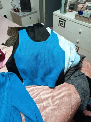 Conjunto de dos prendas: un top de manga corta y un pantalón. - Top con textura. De Sfera XL nueva sin etiquetas - Pantalón de corte recto. De pimkie talla 42 el pantalón si está usado. Precio por packs 8.50 Prenda suelta 5€