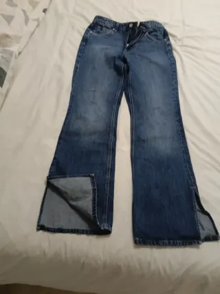Pantalones tejanos de la marca Mango, con un diseño moderno y cómodo. Los compre está temporada y solo los he lavado. Me van grandes. Pone talla 36 pero son 38. - Corte acampanado. - Aberturas en los bajos. - Cierre de cremallera y botón.