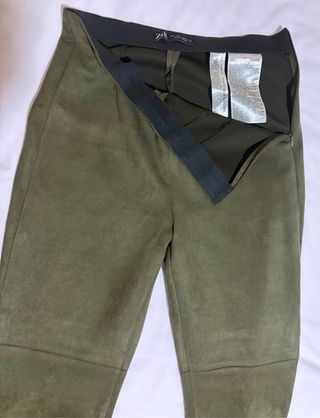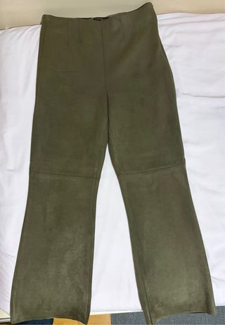 Pantalones de corte acampanado en color verde oliva. Mide cintura goma 37 cm. da hasta 45 cm. Pierna 24 cm. Tobillo 22 cm. Tiro 32 cm. Largo 95 cm. Polyester 92%, Elastan 8%. - Material con acabado similar al ante. - Diseño de tiro alto. - Costuras visibles en las perneras.