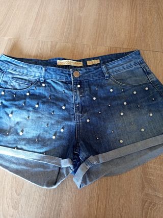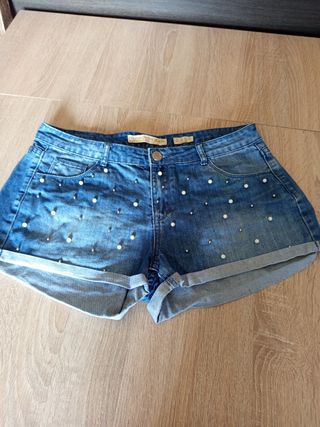 Pantalones cortos vaqueros de mujer con un diseño moderno y detalles de perlas. - Estilo shorts vaqueros. - Decorados con pequeñas perlas. - Talle alto.