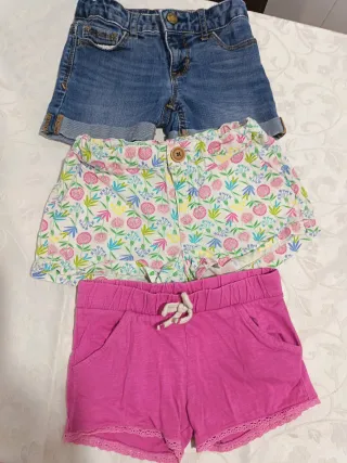 Lote de tres pantalones cortos para niña, perfectos para el verano. - Pantalón vaquero con vuelta. - Pantalón estampado floral. - Pantalón rosa con cintura elástica y cordón. - talla 5-6