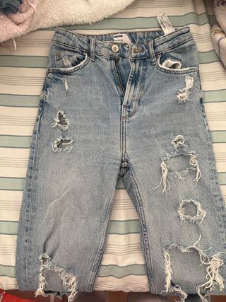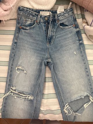 Pantalón vaquero de corte recto con un estilo desgastado y moderno. - Diseño con rotos y detalles desgastados. - Cintura alta. - Cierre de cremallera y botón.
