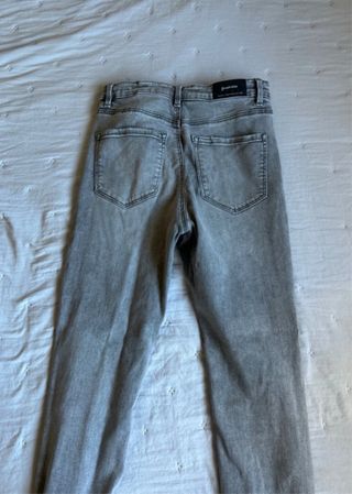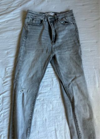 Pantalones pitillo de color gris. Tienen un corte ajustado y moderno. - Diseño de cinco bolsillos. - Cierre de cremallera y botón. - Detalle de rotos en la rodilla izquierda.