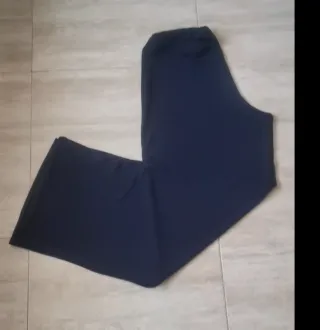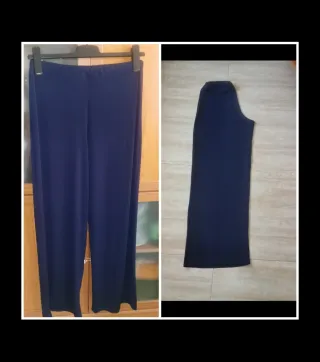 Ma2 *Pantalón largo de corte ancho, color azul marino, en tejido elástico 95% poliéster y 5% elastano, con goma elástica en la cintura y pata ancha, para chica/mujer. Made in France, talla única, pero sirve hasta la talla L 40. Medidas: 33 cm de contorno de cintura (sin estirar el tejido) 53 cm de contorno de cintura, con el tejido estirado 107 cm de largo 29 cm de ancho de pata Buen estado Hago envíos