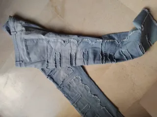 Pantalón vaquero con un diseño moderno y detalles deshilachados. - Tejido elástico para mayor comodidad. - Adornos deshilachados a lo largo de las perneras. - Estilo desgastado y actual.