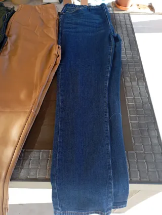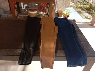 Conjunto de tres pantalones para mujer. - Pantalón negro.de cuero talla XL - Pantalón marrón.de cuero talla XL - Pantalón azul.vaquero Talla 46