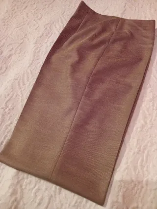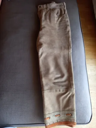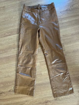 Pantalones de piel en tono marrón. Un básico versátil para cualquier armario. Pone talla 42 pero talla 36 ya que es muy pequeño - Material: Piel. - Color: Marrón. Las hebillas para poner el cinturon estan recosidas