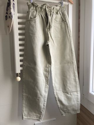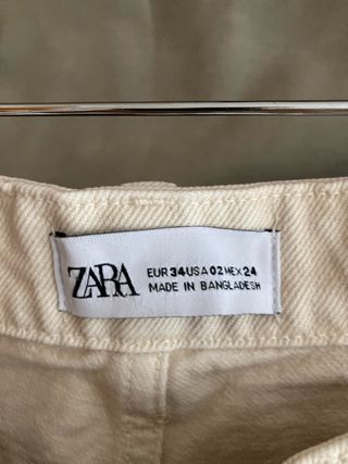 Pantalones vaqueros de color beige de la marca Zara. Tienen un corte recto y el bajo deshilachado. - Cintura alta. - Cierre de cremallera y botón. - Bolsillos delanteros y traseros.
