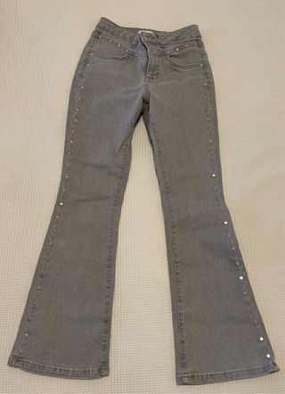 Pantalón vaquero acampanado con detalle de tachuelas a lo largo de las perneras. - Diseño de tiro alto. - Cierre con cremallera y botón. - Ligeramente acampanados. - Bolsillos delanteros y traseros.