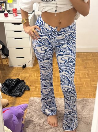 Pantalones finos con un llamativo estampado. SUPER ELASTICO SE ADAPTA AL CUERPO - Diseño de remolinos en azul y blanco. - Corte acampanado. - Detalle de aro en la cintura.