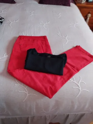 Conjunto de pantalón y camiseta. - Pantalón de color rojo. - Camiseta de color negro.