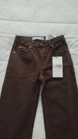 Pantalón vaquero de corte recto en color marrón chocolate. - Cintura alta. - Cierre con cremallera y botón. - Bolsillos delanteros y traseros.