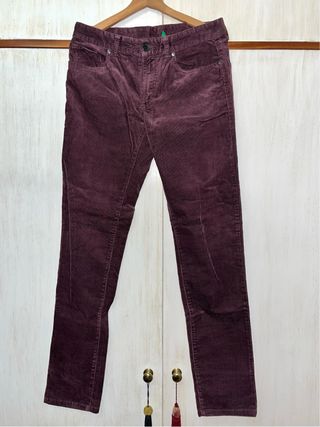 Pantalón slim de pana en color morado berenjena oscuro. La etiqueta pone talla 46 (equivale a una talla 30/40.) la cintura mide 40cm. Puestos en un par de ocasiones y conservados en perfecto estado. - Tejido de pana con textura acanalada. - Diseño clásico de cinco bolsillos. - Cierre de botón y cremallera. #unitedcolorsofbenetton #benetton #hombre #moda #estilo #tendencia #oportunidad #invierno