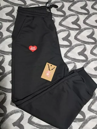 Pantalones deportivos negros con un diseño de Care Bears. Talla S - Parche de corazón rojo con logo. - Colgante de oso rosa con collar.