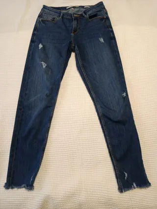 Pantalón vaquero de corte moderno. - Diseño desgastado. - Tiro medio. - Cierre de cremallera y botón Talla 42