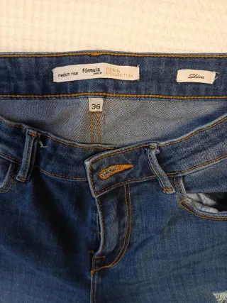 Pantalón vaquero de corte moderno con detalles desgastados y bajos desflecados. - Diseño con rotos. - Bajos con acabado deshilachado. Talla 36. Fórmula Joven. El Corte inglés. Medium rise. Denim Collection Slim