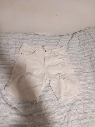 Pantalones cortos de Bershka en color blanco con un diseño desgastado. - Estilo vaquero. - Detalle de rotos. - Cintura con trabillas para cinturón.