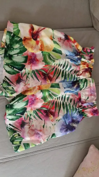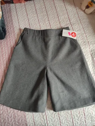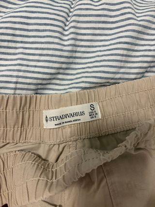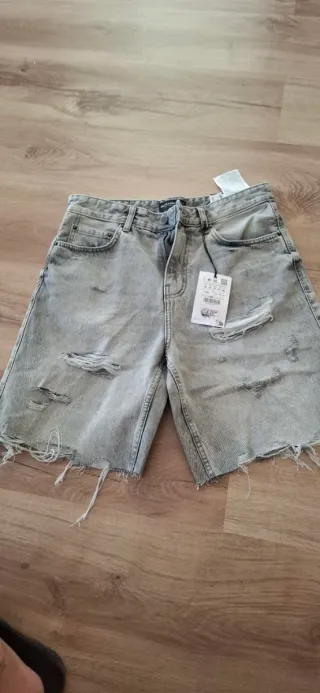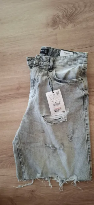 Talla S pero es como XS. Bermudas anchas de paño. Tiro alto y por medio muslo más o menos REBAJADO
